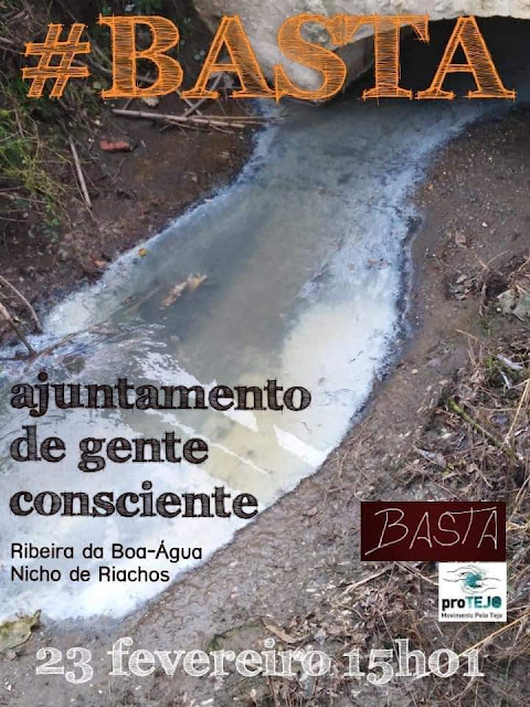 No próximo Sábado, dia 23 de fevereiro, às 15h01m, a população do Concelho de Torres Novas vai sair à rua num protesto a que se resolveu chamar de “AJUNTAMENTO DE GENTE CONSCIENTE”, junto à Ribeira da Boa-Água no Largo do Nicho-Riachos (perto do Torreshopping em Torres Novas), organizado pelo BASTA – Movimento informal de cidadãos com o apoio do proTEJO – Movimento pelo Tejo, em defesa destes recursos hídricos e das populações afetadas pela sua poluição e degradação.