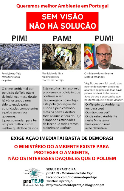proTEJO JÁ APRESENTOU DENÚNCIA À COMISSÃO EUROPEIA, PETIÇÃO AO PARLAMENTO EUROPEU E DENÚNCIA POR CRIME PÚBLICO À PROCURADORIA-GERAL DA REPÚBLICA POR CRIME AMBIENTAL E GRAVE PROBLEMA DE SAÚDE PÚBLICA POR EXTREMA POLUIÇÃO DO RIO TEJO QUE CAUSOU UMA VASTÍSSIMA MORTANDADE DE PEIXES